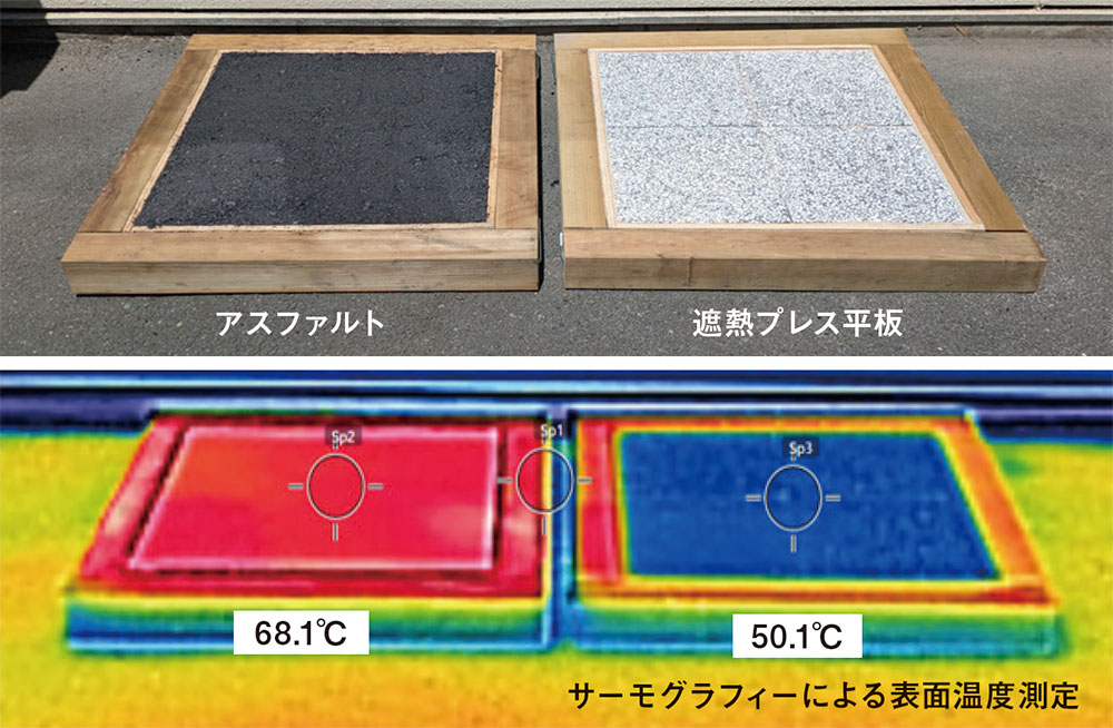 様々な天然石材の組み合わせや、異なる成型方法を試しながら試作と測定を繰り返し、最大級の遮熱舗装ブロックを完成させました。「遮熱プレス平板」は夏季の路面温度の上昇を最大で約21.9°Cと大幅に抑えることが可能です。