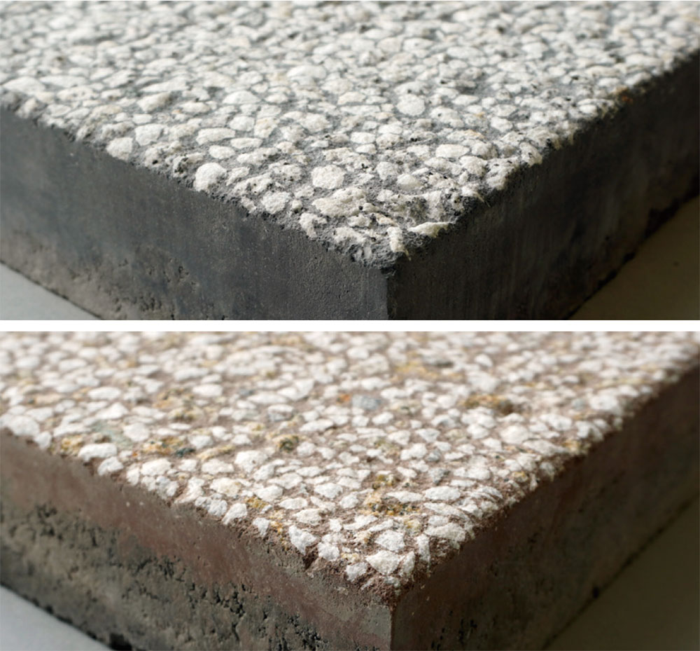 遮熱性能が高い石材や遮熱顔料を高いプレス圧によって成型するので、天然石のような素材感と強度を備えています。また、表層に使用されている石材そのものに高い遮熱性能があるため、過酷な屋外環境でも経年変化による遮熱材料の劣化が少なく、長期間の遮熱効果が期待できます。
